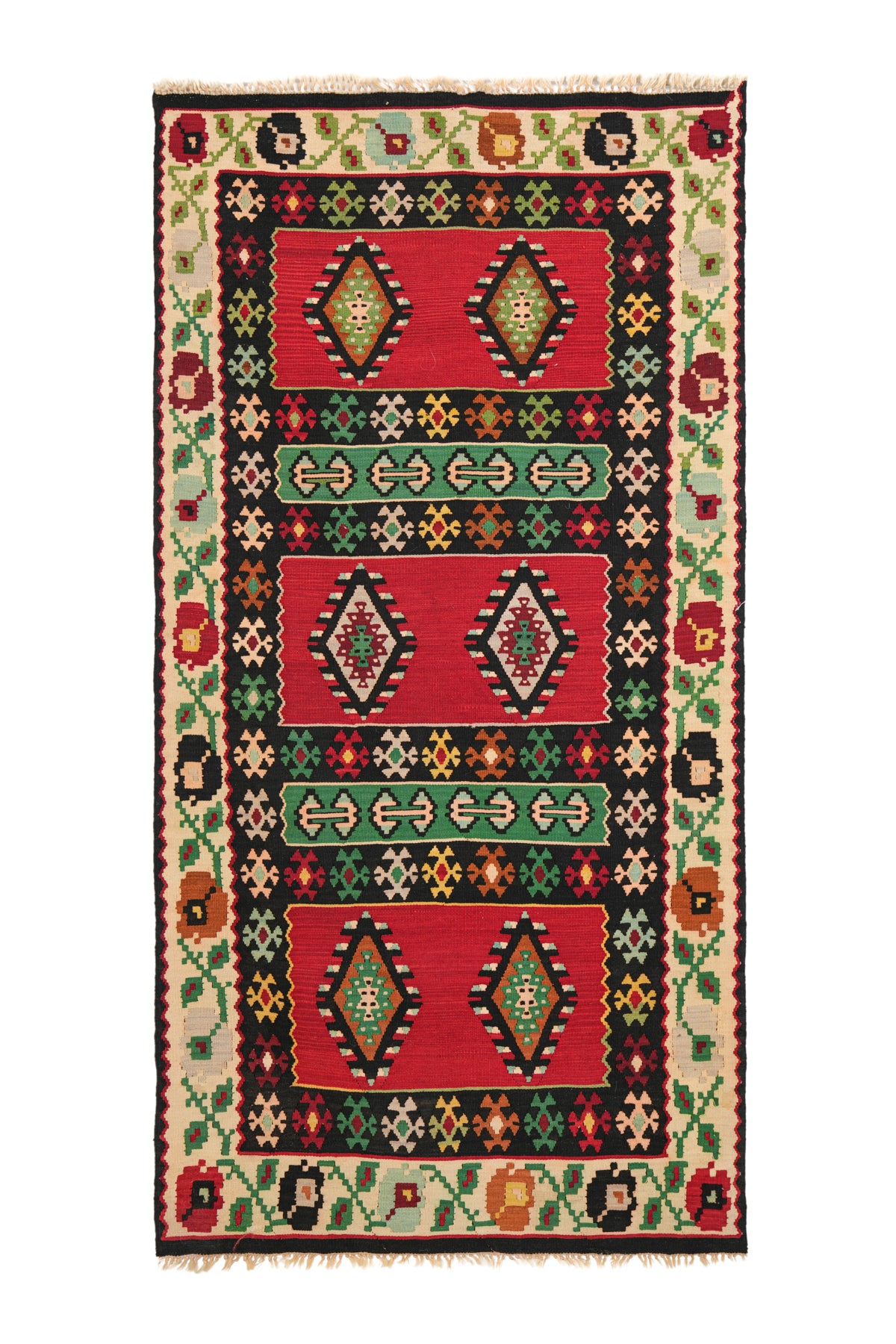 This vintage Balkan kilim bursts with vibrant colour and bold geometric patterns. The central field features three rich red panels, each adorned with green, black, and ivory diamond-shaped medallions, framed by jagged black edges. Bands of multicoloured motifs between the panels, including X-shaped and arrow-like figures, add rhythm and texture. The wide ivory border is decorated with stylised floral and vine motifs in red, green, black, and ochre, creating a lively contrast against the strong central design. Handwoven in wool, this flatweave kilim beautifully reflects the Balkan folk tradition, known for its cheerful palette and symbolic ornamentation.