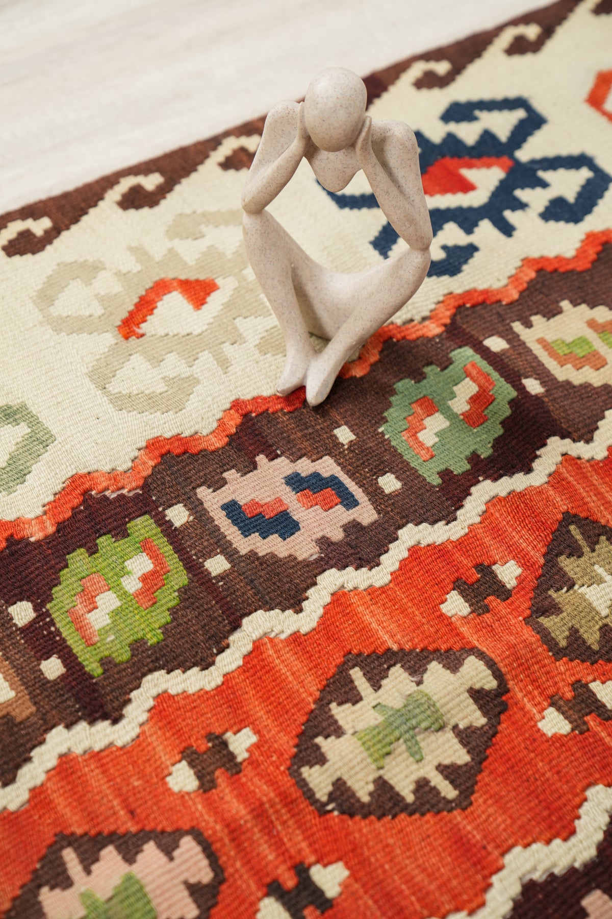 This vintage Sarkoy kilim from the Balkans dazzles with its vivid tribal design. It features a bold central panel of geometric medallions in rich rust, chocolate brown, and olive green tones, framed by cream borders adorned with stylized latch-hook and ram’s horn motifs in vibrant red, green, blue, and beige. Handwoven with fine wool, its sharp, crisp patterns and intense colour contrasts reflect the renowned craftsmanship of Sarkoy weavers, making it a striking statement piece full of Balkan folk spirit.