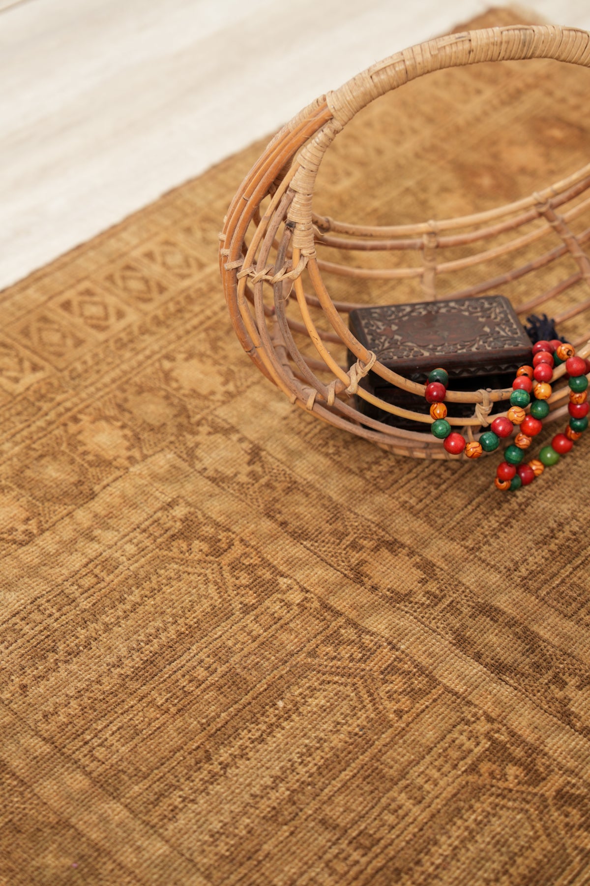This earthy-toned vintage Baloch rug is a soulful piece rooted in tribal tradition and subtle elegance. Woven by hand using soft wool, the rug features a warm, monochromatic palette of camel, sand, and sepia brown tones that evoke the arid landscapes of Baluchistan.