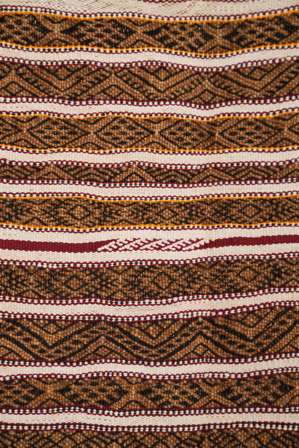 This is a vintage Moroccan Beni Ouarain kilim, celebrated for its earthy simplicity and tribal authenticity. It features alternating bands of delicate geometric patterns and open stripes in natural brown, cream, and subtle soft yellow and rust touches, creating a balanced, rhythmic look. The handwoven wool texture feels raw and organic, embodying the nomadic Berber weaving tradition. With its understated palette and minimalist design, this kilim adds warmth, texture, and a grounded, artisanal feel to modern and rustic interiors.
