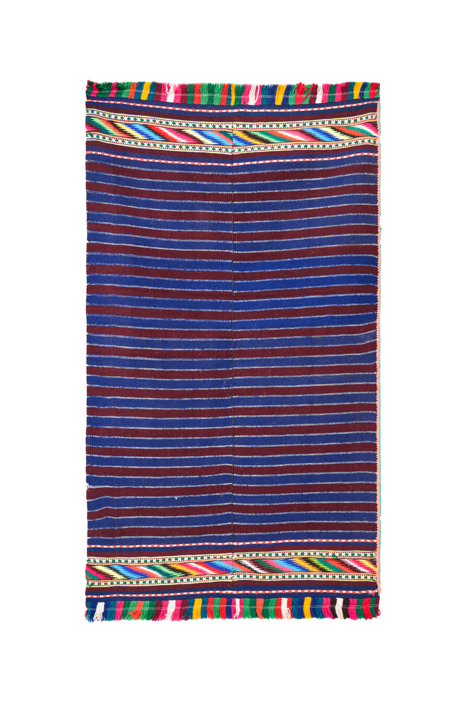 This vintage Swati woollen textile is a vibrant handwoven piece from Pakistan’s Swat Valley, known for its rich weaving traditions. The main body features deep indigo and maroon stripes, finely accented with thin white lines, creating a rhythmic, understated pattern. Along the top and bottom edges, bright woven bands burst with multicoloured zigzags, stars, and geometric motifs, framed by playful fringes in green, red, yellow, white, and black. Traditionally used in clothing, shawls, or household decor, this textile blends rustic wool textures with lively, celebratory colourwork.
