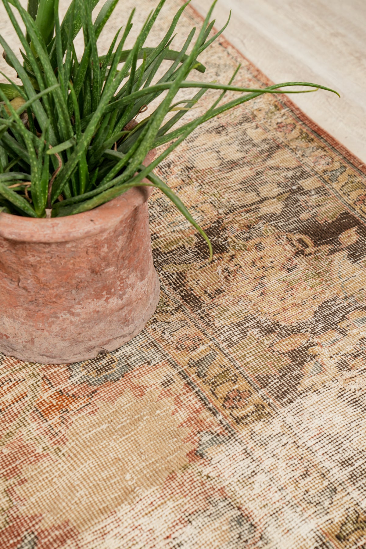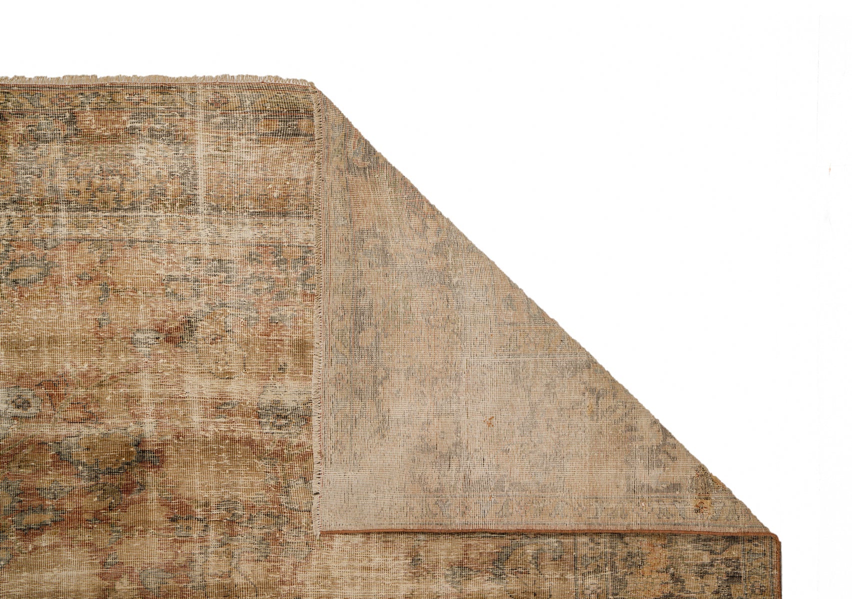 The rug’s once-prominent motifs blend softly into the background, creating a dreamy, almost watercolour-like effect. The original intricate floral and vine work remains just barely visible under the patina. The border frames the field with a series of narrow bands filled with scrolling vines and rosettes, echoing the floral richness of the centre but now softened into a harmonious atmospheric blend.