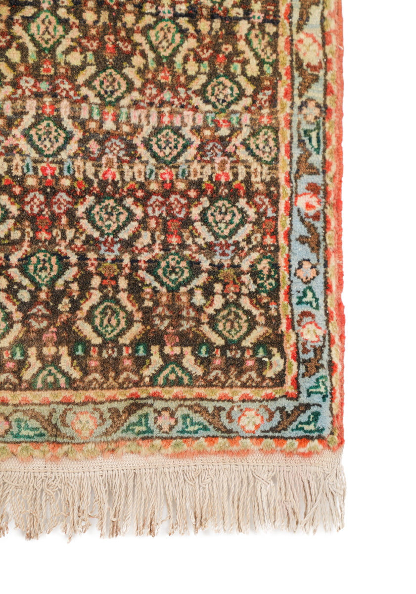 This refined vintage Persian Tabriz rug features a dense allover Herati pattern, with diamond and rosette motifs elegantly woven in rich tones of earthy brown, forest green, soft ivory, and subtle coral highlights. Framed by detailed borders with scrolling floral and vine elements, the rug showcases the delicate precision and masterful craftsmanship for which Tabriz weavers are renowned. Its intricate design and harmonious palette make it an exquisite choice for adding timeless sophistication and artisanal beauty to both classic and modern interiors.
