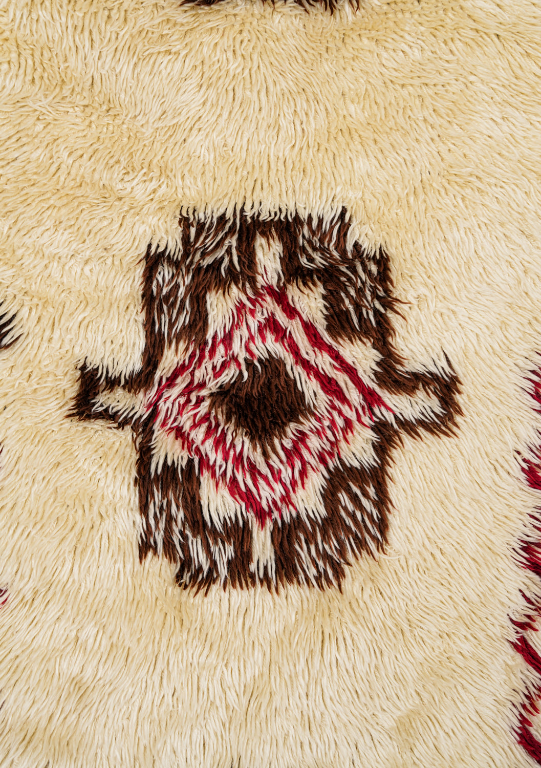 This vintage Scandinavian hallway rug is a long, narrow Rya runner, reflecting mid-century Nordic design aesthetics. It features a luxurious shaggy pile in a creamy ivory base, offering warmth and texture. The pattern runs symmetrically along the length, with large geometric medallions in black, muted red, and soft pink, spaced evenly down the centre. These are framed by zigzag and diamond motifs along the edges, adding rhythmic movement and a playful, almost folk-art energy. Likely handwoven in Sweden or Finland during the 1960s and 1970s, it blends modernist simplicity with traditional Scandinavian craftsmanship, making it a decorative and functional piece for narrow spaces like hallways.