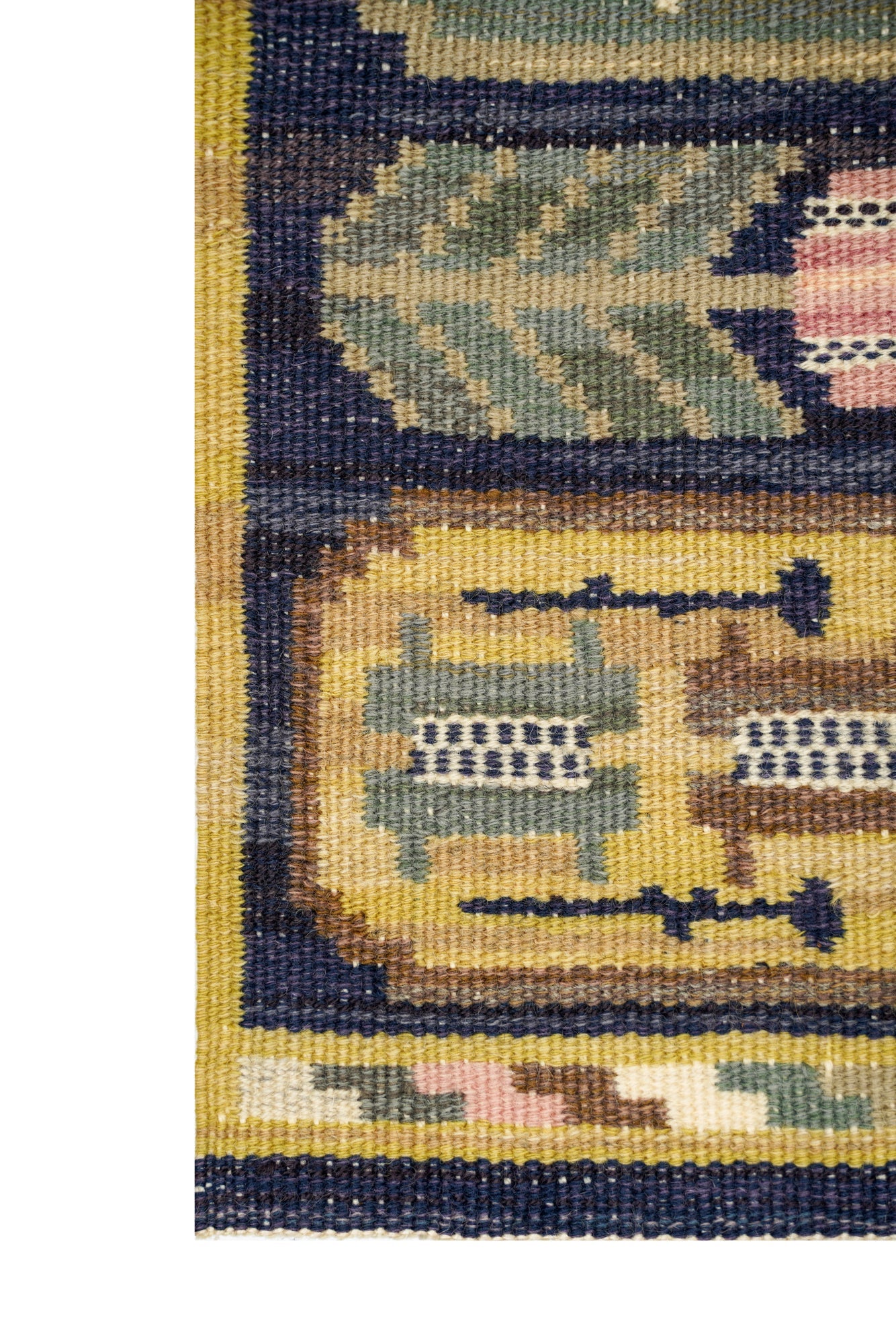 This antique Swedish kilim tapestry, titled The Medallions by Märta Måås-Fjetterström, is a striking example of Scandinavian textile artistry. Featuring a rhythmic arrangement of stylised floral medallions in soft greens, golds, pinks, and creams, the design is set against a deep indigo background, creating a harmonious yet bold contrast. Each medallion contains symbolic, almost abstract botanical motifs, reflecting Måås-Fjetterström’s signature blend of nature-inspired forms and geometric precision. This tapestry embodies timeless Swedish craftsmanship, making it a coveted piece for mid-century and modernist woven art collectors.