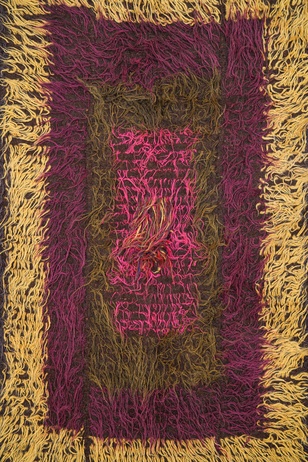 The design is abstract and modernist in its visual language, composed of concentric rectangles that pulse outward from the centre. Each band of colour ranging from deep plum and earthy olive to fiery red, mustard yellow, and magenta creates a vibrant rhythm that feels both spontaneous and intentional. The colour transitions are expressive, enhanced by the playful tufts that fringe the borders, adding movement and energy.
